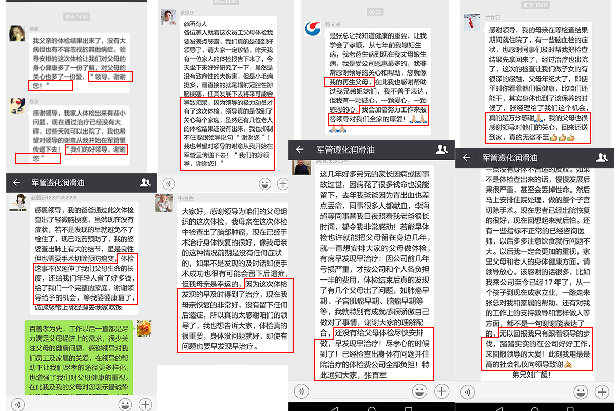 自從2018年相關(guān)數(shù)據(jù)顯示公司已經(jīng)扭轉(zhuǎn)連續(xù)多年虧損的狀態(tài),總經(jīng)理張百軍首先想到的是——公司員工的健康問題,于2018年3月組織全體員工體檢,對于體檢張百軍總經(jīng)理要求不能敷衍了事,要針對全體員工的情況,制定相應(yīng)的體檢項目,幾經(jīng)周折最終選定在唐山人民醫(yī)院體檢中心做體檢工作。沒有想到員工的健康問題只是張總關(guān)心的問題之一,隨后張總召開中層領(lǐng)導會議提出給員工父母體檢的想法,隨著時間的流逝,父母的年齡在不斷的增長,身體狀況也是每況愈下,但是他們對自我身體的健康意識卻非常的薄弱。于是接下來開始動員全體員工勸說父母參加公司組織的體檢活動,又指定專人去各個醫(yī)院了解針對老年人的體檢項目,全體員工各司其職進行著前期的籌備工作,于2018年8月完成了公司所有員工父母的體檢工作,所有員工父母對張總此次給予大家的福利深感謝意。其中多名員工的父母在這次體檢中受益匪淺,及時將病情扼殺在搖籃之中,為此多名員工表達了對張總的感謝。